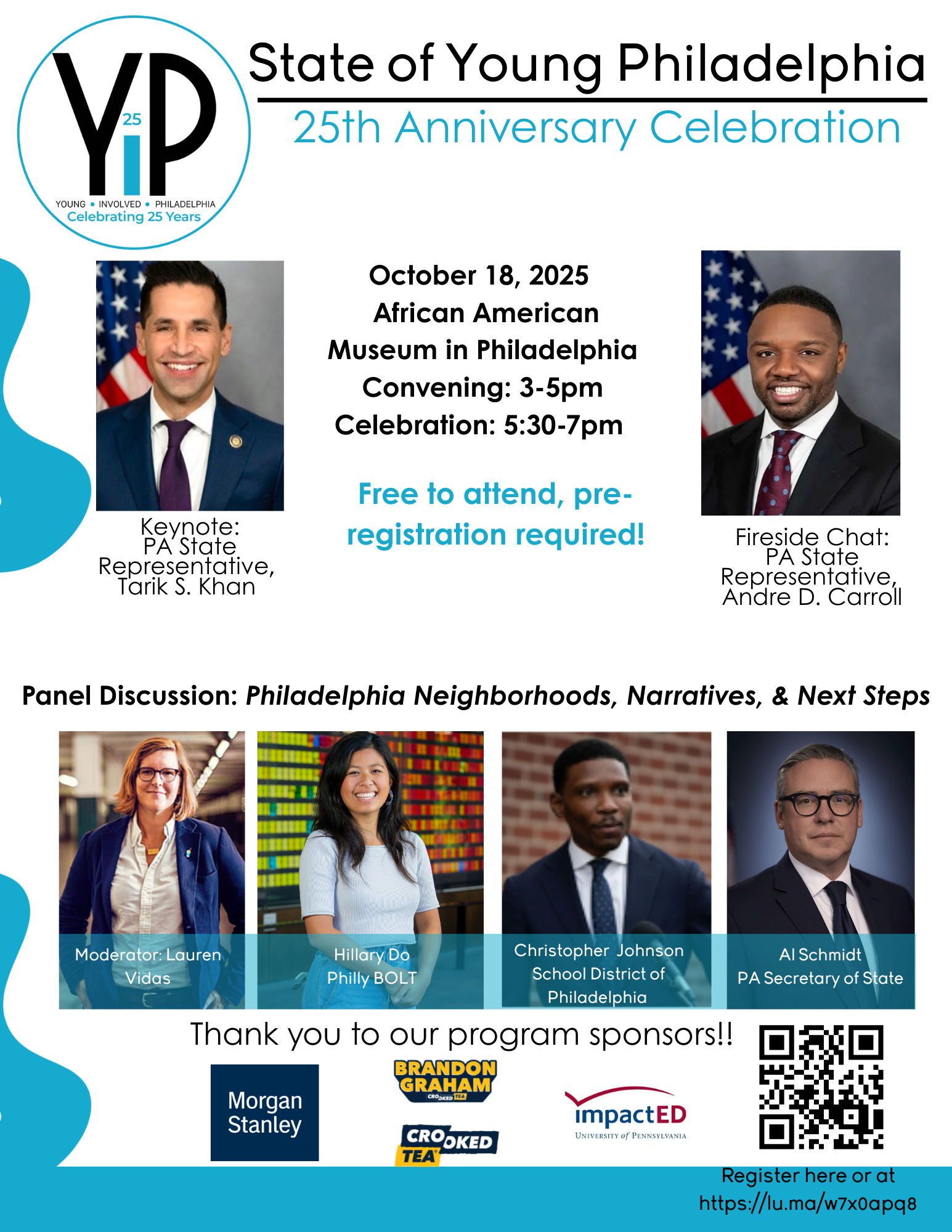 2025 is special! Marking 25 years of YIP's existence amplifying young voices and helping shape our city’s civic, and social future. Please join us after our event for our 25th anniversary celebration from 5-7 PM. Learn more about us here!